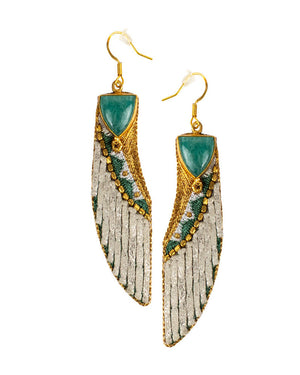 Fait main avec soin, ce bijou allie cuir, fil de soie et pierres semi-précieuses taillées en triangle. Chaque paire est ornée de perles en laiton, doublée de cuir souple et montée sur des crochets en laiton inoxydable et hypoallergéniques ! On craque pour cet été !