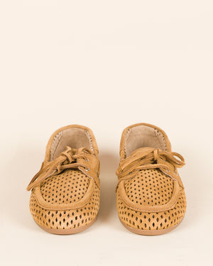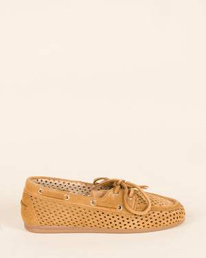 Cuir suédé ajouré / lacets / bout arrondi / semelle plate / coloris cognac