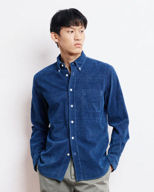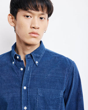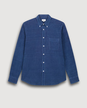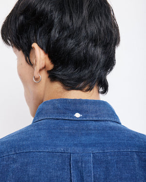 Coupe regular / Col boutonné souple / Gorge piquée américaine / Boutons en nacre / Pli d’aisance au dos / Finition indigo