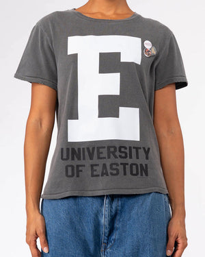 T-shirt University of Easton / Gris délavé / Grand print “E” blanc et inscription “University of Easton” / Manches courtes / Badges sur le côté / Esprit vintage