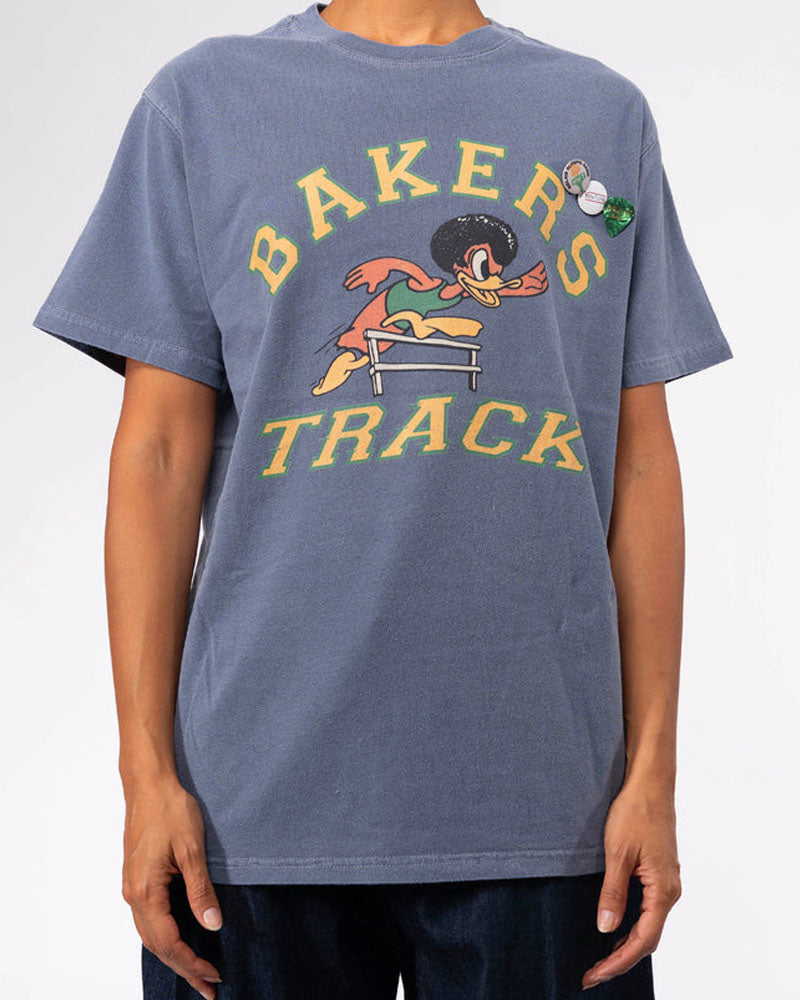T-shirt Newtone Trucker / Couleur denim / Print "Bakers Track" jaune / Manches courtes / Badges sur le côté / Style fun et décalé