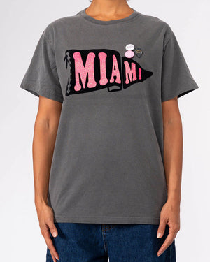 T-shirt Newtone Trucker / Gris anthracite / Print "Miami" rose fuchsia / Manches courtes / Badges sur le côté / Vibes rétro et estivales.