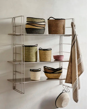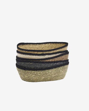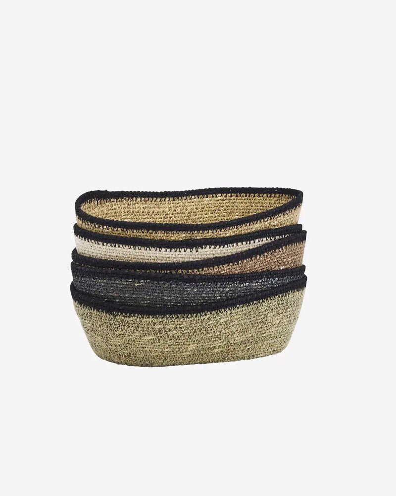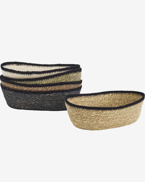 Panier ovale en jonc de mer / tressage artisanal réalisé en inde / mélange de jonc de mer et de fil de coton / nuances charbon, noyer, sauge, naturel, écru et noir / idéal pour présenter le pain ou les fruits