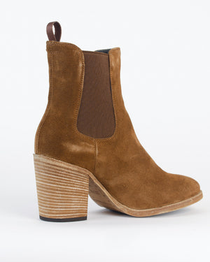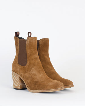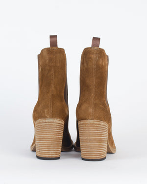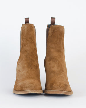 Ces boots en daim couleur camel avec talon épais sont parfaites pour un look casual-chic. Leur design revisité offre un confort optimal et se porte aussi bien avec un jean retroussé qu'une robe fluide pour un style bohème et élégant. Un indispensable à avoir dans son dressing pour un automne stylé ! Taille plutôt grand.