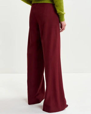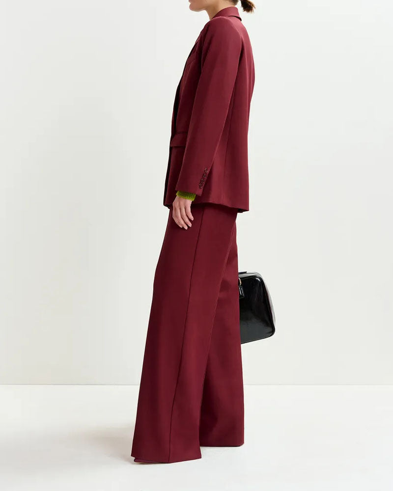 Pantalon taille haute / Jambe large / Taille élastique et zip dissimulé / Poches italiennes + poches passepoilées arrière / Plis pressés devant et dos