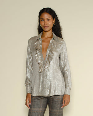 chemise argentée / détail de froufrous sur le devant / col chemise classique / coupe fluide et féminine / avec un pantalon tailleur ou un jean