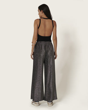 Pantalon éponyme / Inspiration années disco / Confectionné en lurex fluide et brillant / Coupe ample et aérienne / Taille haute élastiquée avec fronces délicates