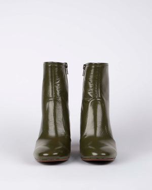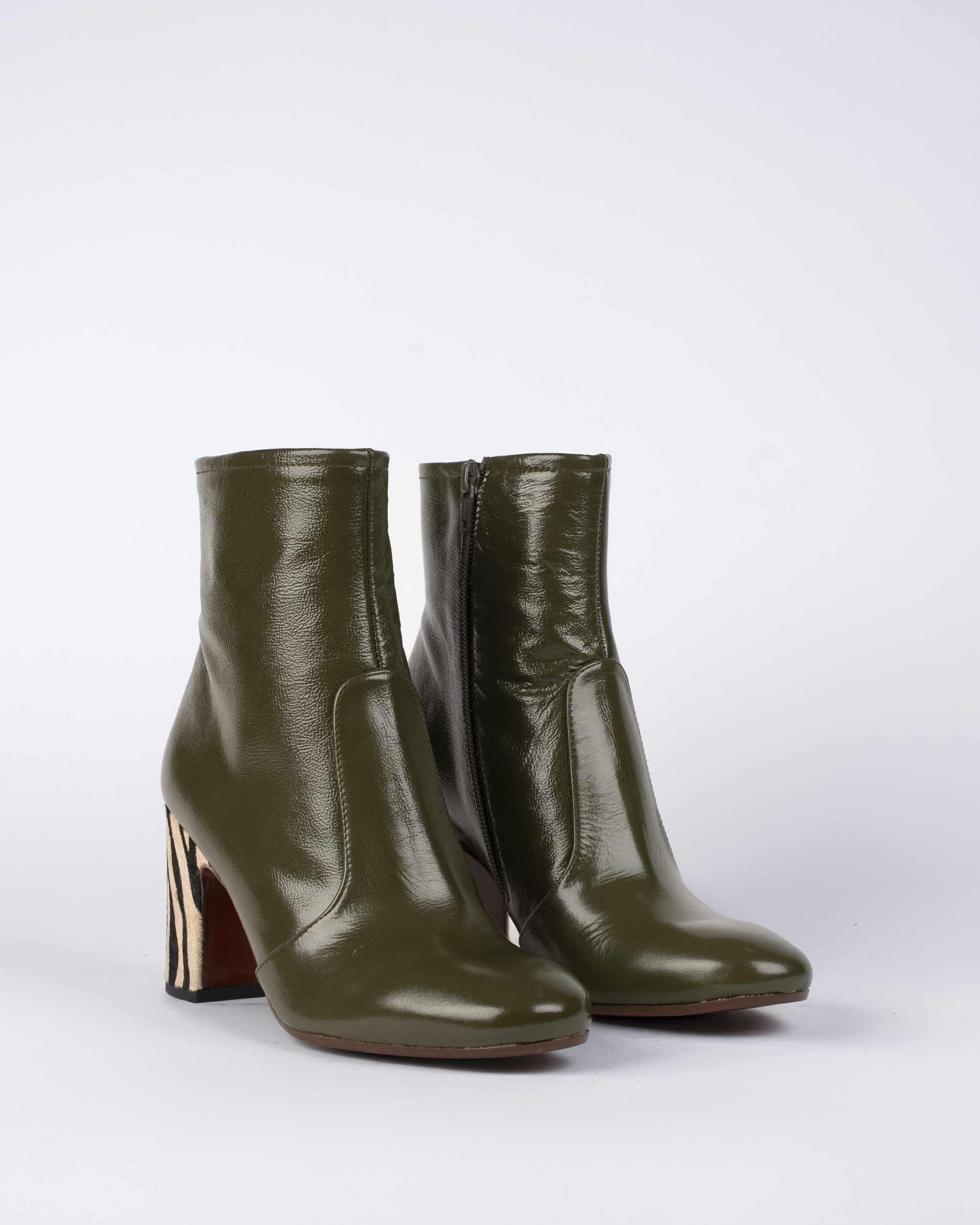 Bottes Chie Mihara / Cuir souple kaki / Talon imprimé zèbre / Contraste graphique