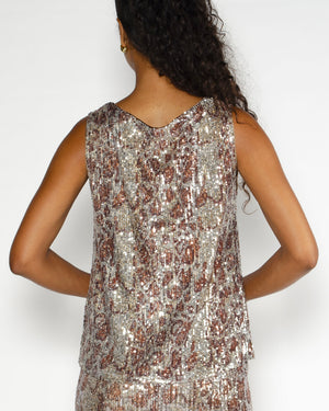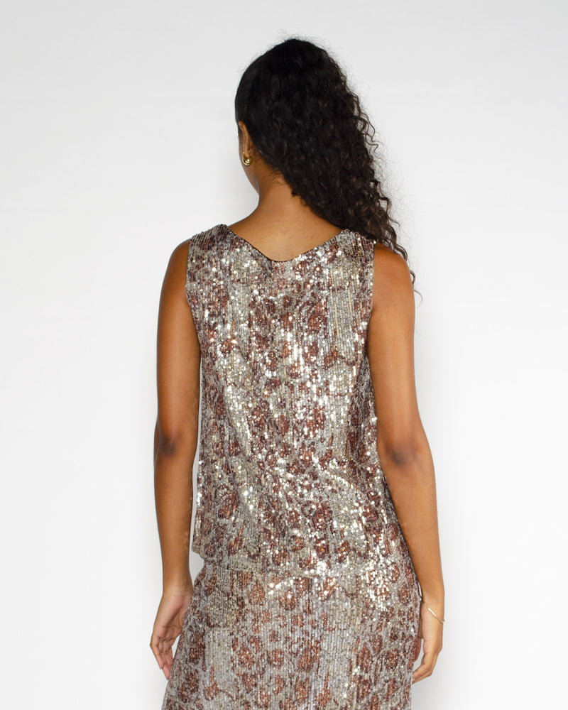 Full sequins brillants / Tons dorés cuivrés / Sans manches / Encolure ronde / Coupe droite et élégante / Tissu souple et lumineux / Style festif et glamour