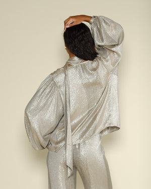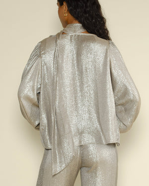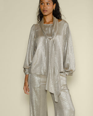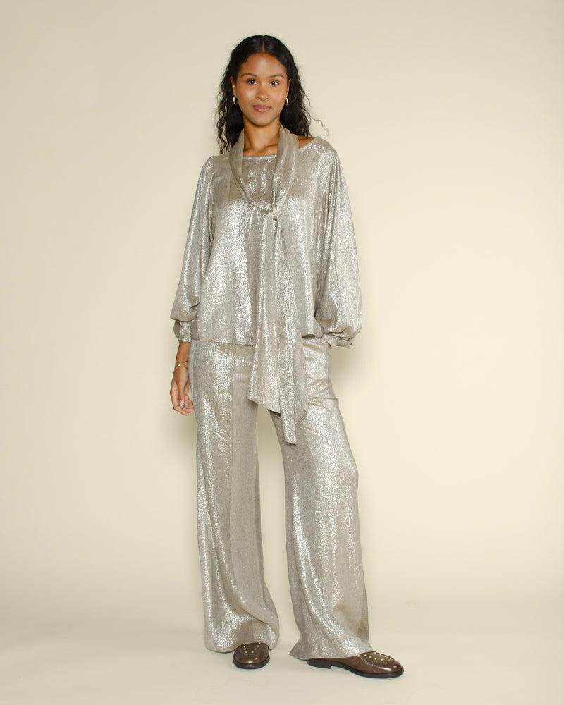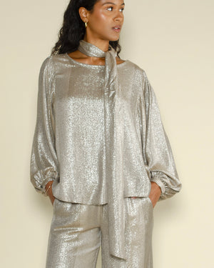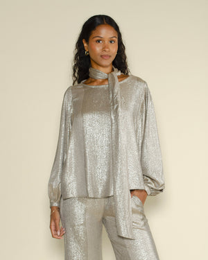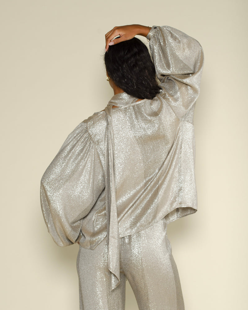 Manches longues légèrement bouffantes / Petite écharpe intégrée à nouer / Coupe fluide / Tissu lumineux et léger / Style élégant et original
