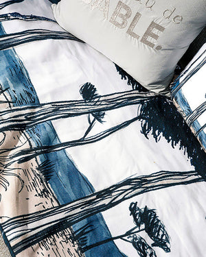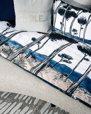 Un édredon Cap Ferret de la marque Pôdevache. On aime ce matelas de bain de soleil thème Natural Cost, rappelant l'esthétique marin. L'édredon est conçu avec des matériaux durables et résistant aux intempéries, lui permettant de décorer vos espaces extérieurs.