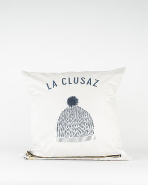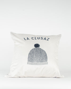 Coussin de la marque Podevache avec un écrit minimaliste et raffiné."La clusaz"