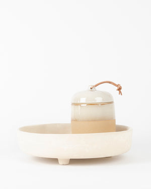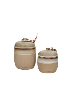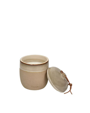 Une bougie conçue en céramique réhaussé d'un émail réactif. La gamme Stromboli présente des formes et des couleurs rappelant celles d'une noisette ou d'un gland et est munie d'une anse de manière à pouvoir soulever facilement le couvercle.