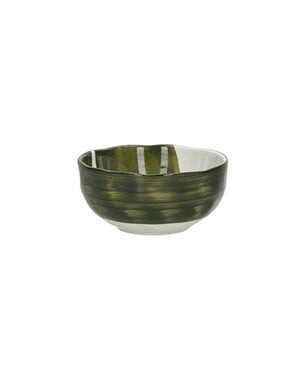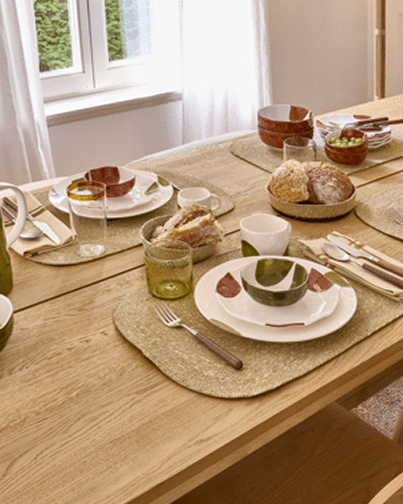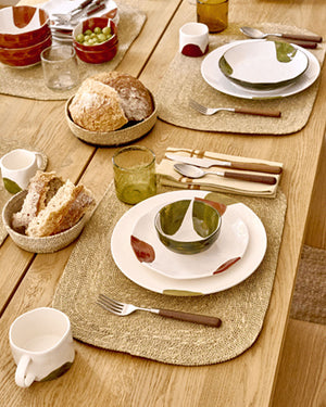 aspect peint à la main / motifs en forme de capsule / tons verts terreux / service de table
