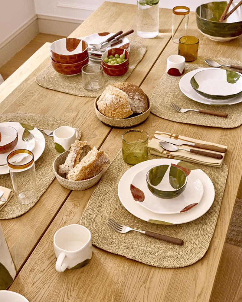 aspect peint à la main / motifs en forme de capsule / tons verts terreux / service de table