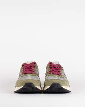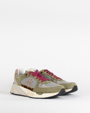 élégance discrète des baskets Premiata / silhouette moderne et affirmée / teinte kaki tendance / lacets bordeaux / empiècement léopard