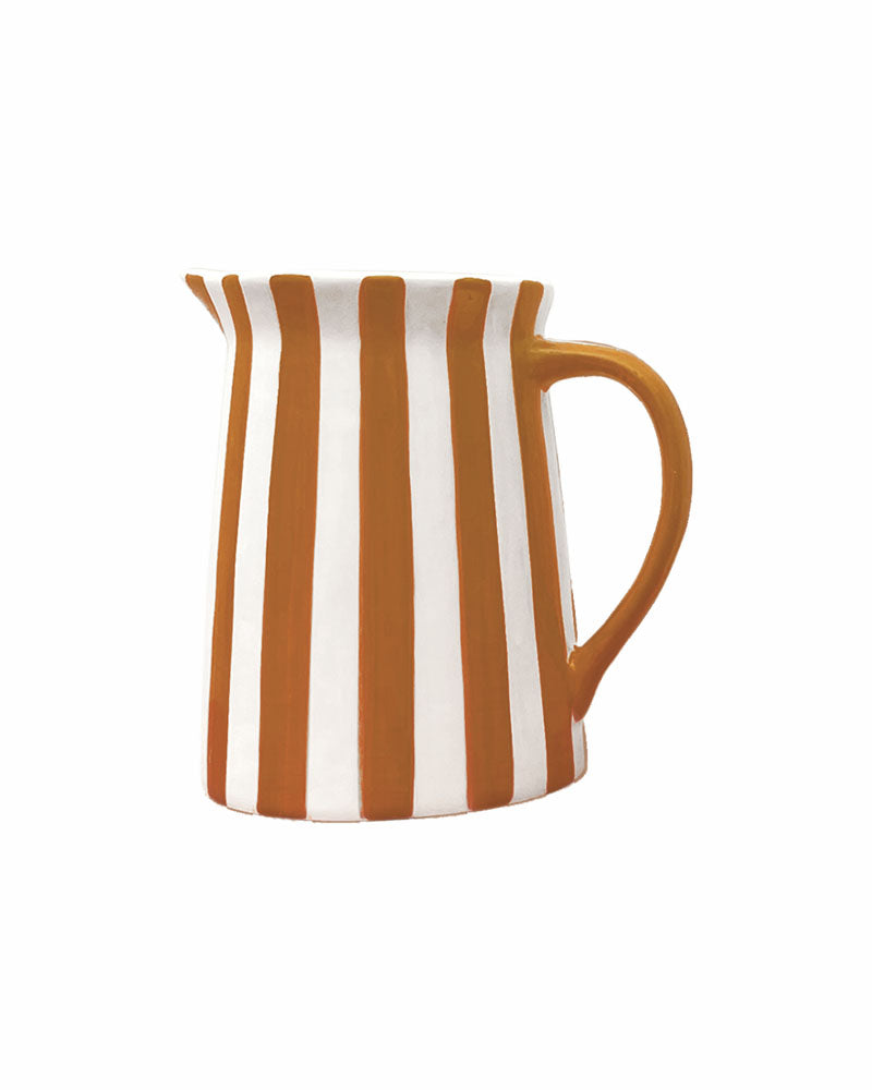 Pichet / capacité de 980 ML / rayures verticales marron peintes à la main / fond écru / anse large intégrée / silhouette légèrement évasée / finition artisanale