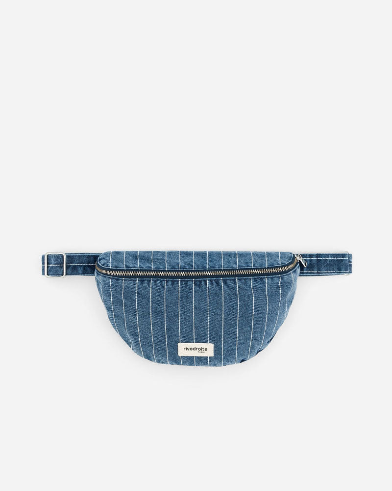 sac banane custine rayé / toile denim bleu patinée effet vintage / fabrication cousue et délavée à la pièce / compartiment principal spacieux pour vos essentiels / anse ajustable