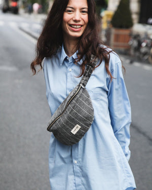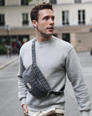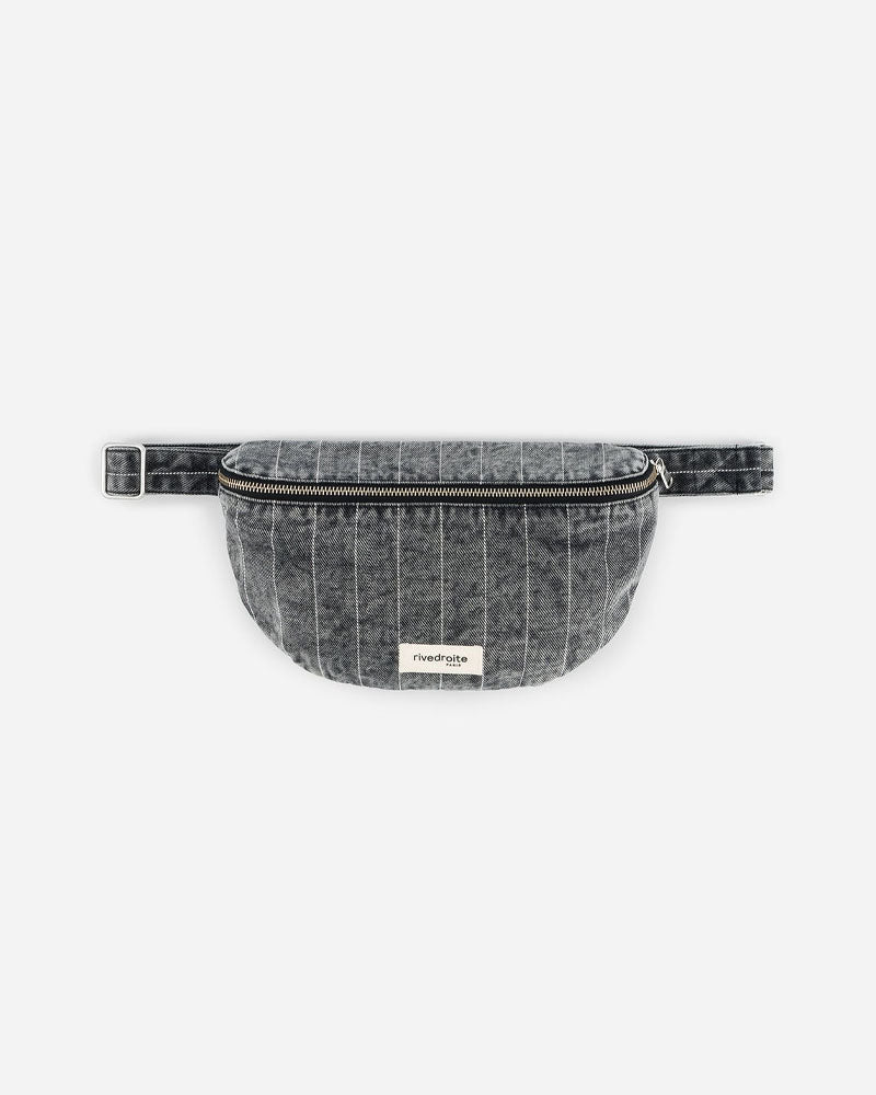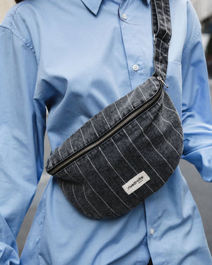 sac banane custine rayé / toile denim noire patinée effet vintage / fabrication cousue et délavée à la pièce / compartiment principal spacieux pour vos essentiels / anse ajustable