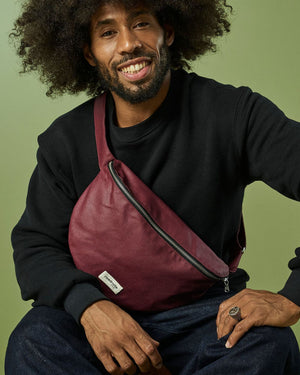 sac banane custine xl / coton recyclé ciré et déperlant / tissu résistant à la pluie / format arrondi pratique / anse ajustable pour un porté modulable