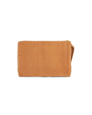 Pochette COYUCA / Velours ras pêche et caramel / Broderies perles plumes et fleurs stylisées / Structure plate / Anse côté et pompon puller