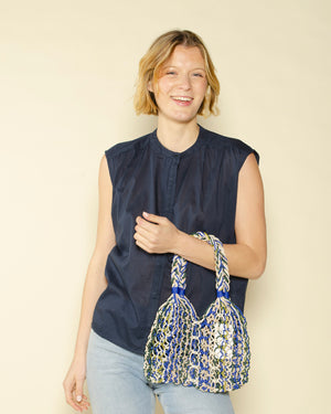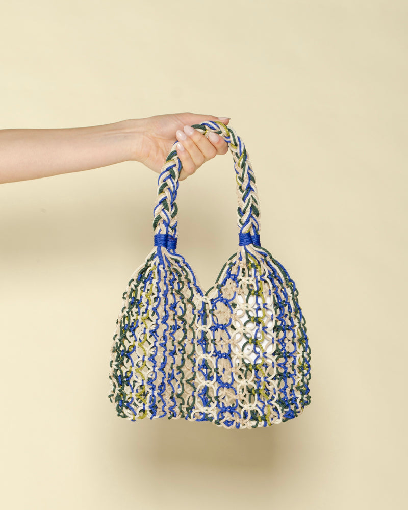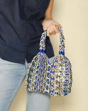 Petit modèle / 100% fait main / Sac filet bleu roi / Format souple et spacieux / Anses tressées pour un porté confortable / Motif coloré et estival