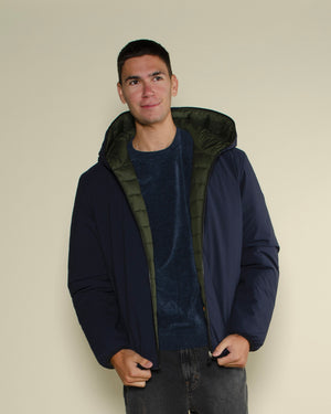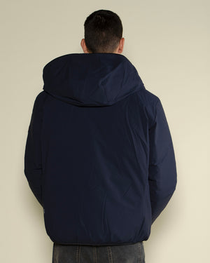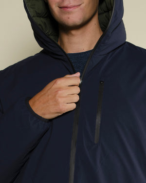 coupe droite / style classique / doublure matelassée / fermeture zip / détails orange fluo / capuche