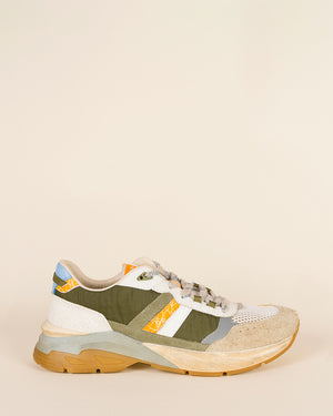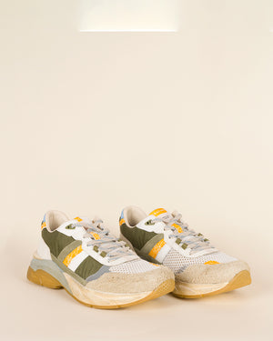 Baskets classique / simple / style urbain/ sport / lacets gris avec détails bleu / détails jaune et blanc sur les cotés de la chaussure / détails moutarde et bleu au niveau de l'arrière de la semelle