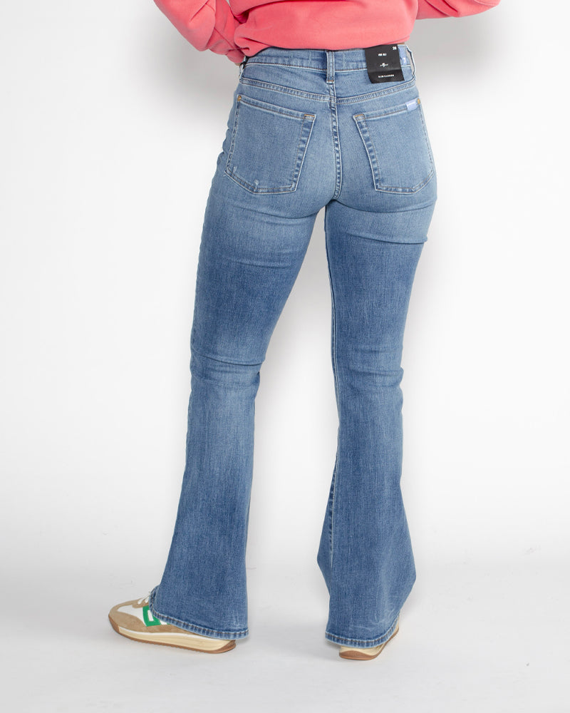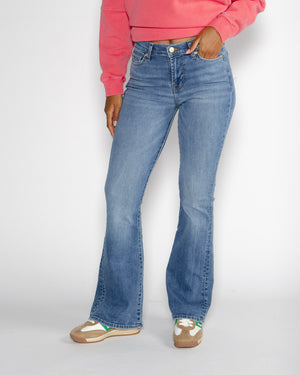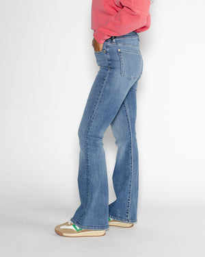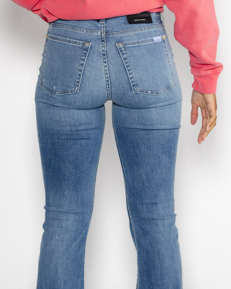 Taille haute flatteuse / Coupe flare évasée & vintage / Denim délavé léger / Style casual-chic moderne / Le jean rétro incontournable
