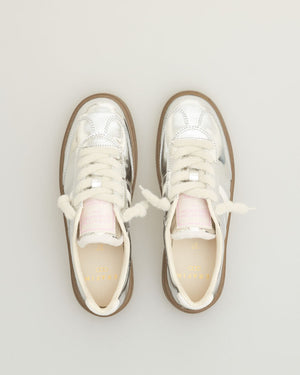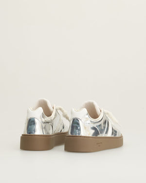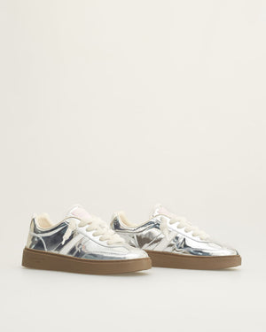 Baskets citadine pour femme avec un look retro qu'on adore mixer avec différents styles. La semelle est marron pour un côté décontracté. La basket est totalement argenté effet vernis. Total confort et tendance, elles ne vous quitterons plus !