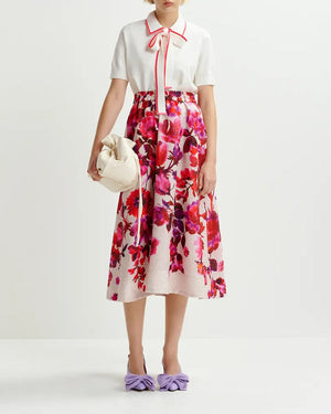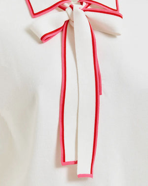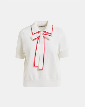 Ce polo ivoire en maille fine de chez Essentiel Antwerp est parfait pour cette saison estivale. On craque pour son col et son nœud au liseré rouge, hyper chic.