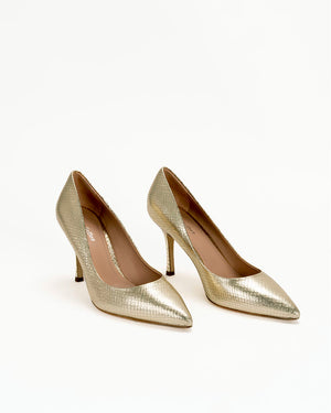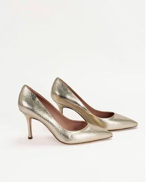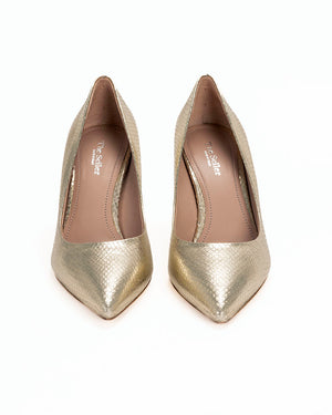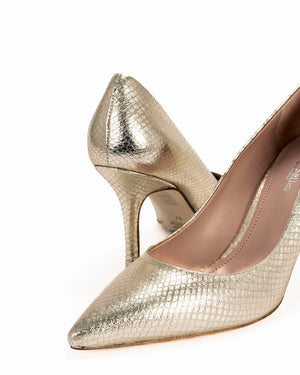 Paire d'escarpins en cuir doré métalissé doré, effet croco avec un talon de 8,5 cm.