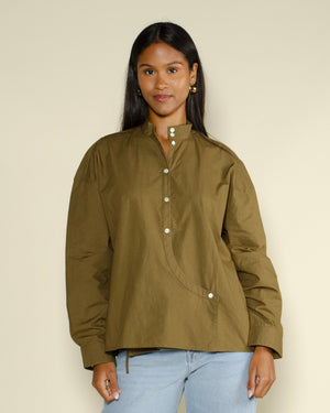 Chemise en coton olive / Coupe droite épurée / Col légèrement montant / Fermeture boutonnée asymétrique / Matière légère et fluide