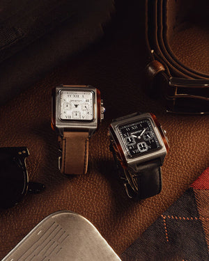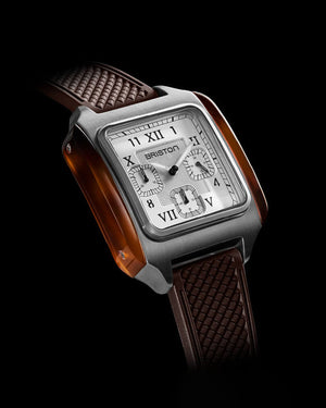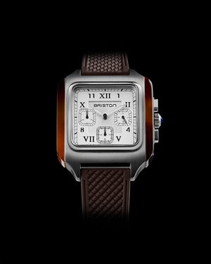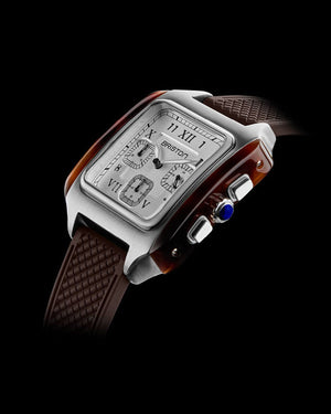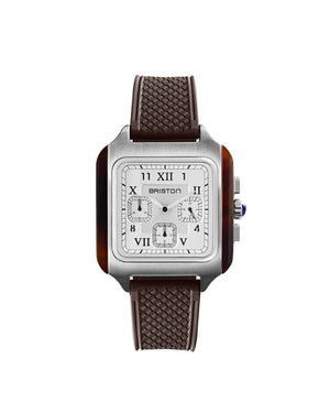 Boîtier carré en acier brossé avec flancs en acétate écaille. Couronne avec un cabochon en lapis Lazuli. Cadran noir double couche, sous-cadran blanc avec chiffres romains et arabes creusés. Partie centrale avec motif guilloché. Chronographe 3 Compteurs. Aiguilles style "Dauphine" en acier brossé avec inserts SuperLuminova. Glace minérale ultra-résistante bombée. Bracelet 20 mm exclusif Briston, interchangeable, en caoutchouc. Calibre à quartz Miyota JS20. Étanchéité 50 m/ 5 ATM.