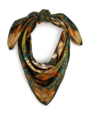 Foulard imprimé fantaisie dans les tons vert et caramel. Un véritable accessoire de mode pour un look tendance et féminin.