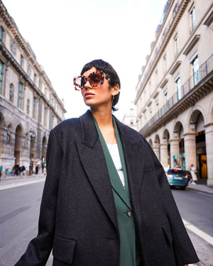 Paire de lunettes de soleil de la marque Iyu Design, forme carrée, monture écaille beige. Lunettes de soleil tout usage, protection élevée contre les rayons du soleil. Ce produit répond à la directive européenne 89/686 EEC en accord avec la norme BS EN ISO 12312-1:2013.