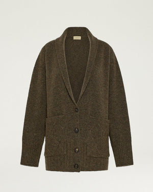cardigan oversize stretch avec effet sweat-shirt / col raglan en grosses côtes / patte de boutonnage à trois boutons en corne / poches plaquées avec travail en losanges en relief