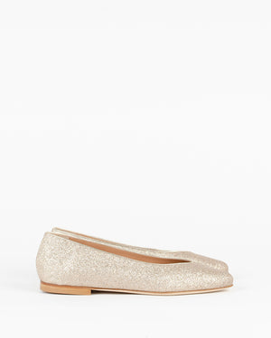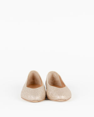 Une paire de ballerines de la marque Anniel or pailleté que l'on adore chez Pop and Shoes. C'est un modèle de chaussures pour femmes super confortable et très élégant, à associer à toutes vos robes longues !