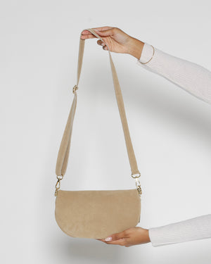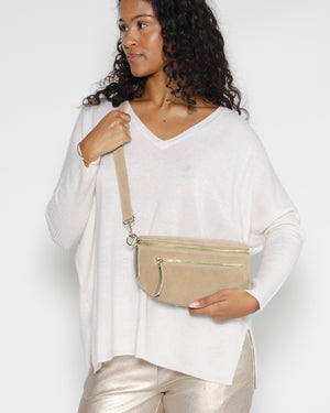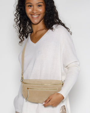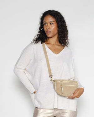 Banane en daim beige de chez Pop Philosophy. Les deux poches zippées de ce sac banane permettent d'offrir plusieurs compartiments. De plus, le cuir doux et souple associé aux finitions dorées en font une pièce à la fois fonctionnelle et chic, idéale pour une journée en ville ou une escapade le week-end.
