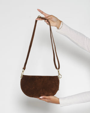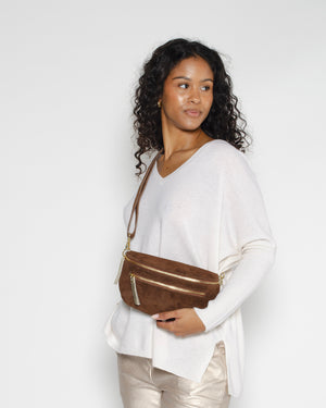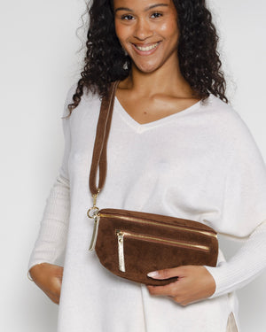 Banane en daim chocolat de chez Pop Philosophy. Cette banane, à la fois pratique et stylée, est l'accessoire parfait pour vos tenues quotidiennes. Le daim marron avec des détails dorés, apportent une touche élégante et raffinée au sac.
