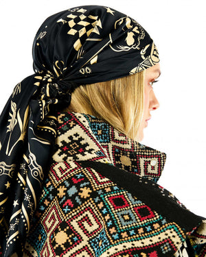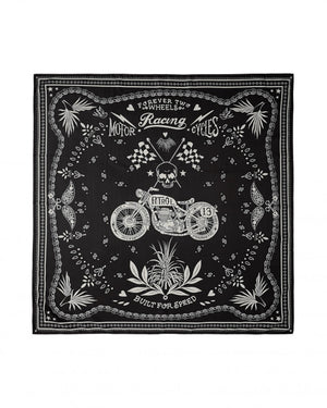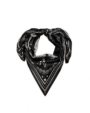 Petit modèle / Foulard biker chic / Imprimé tête de mort et moto / Fond bordeaux féminin / Motifs fleurs, étoiles & cachemire / Accessoire versatile (foulard ou paréo)