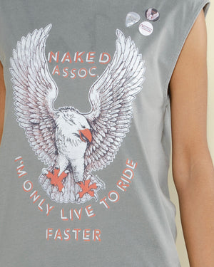 Ce débardeur gris style biker de la marque Newtone, orné d'un grand aigle blanc, est parfait pour un look edgy, rock et vintage. Avec les deux badges emblématiques de la marque, il est idéal à porter en été, il s'associe parfaitement à un short long pour un look décontracté et stylé.