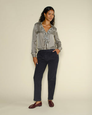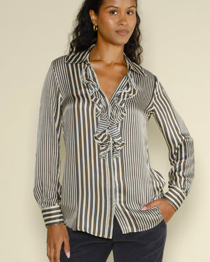 À rayures noires sur fond blanc / Froufrous sur le devant / Col classique / Coupe fluide / Tissu léger / Style bohème chic / Fermeture boutonnée