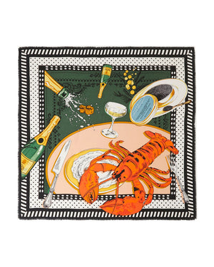 Foulard imprimé fantaisie sur le thème du champagne et du caviar, foulard carré en laine mélangé. Un véritable accessoire de mode pour sublimer votre dressing.