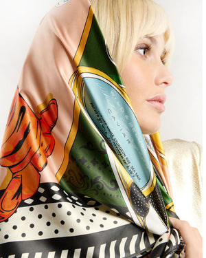 Foulard imprimé fantaisie sur le thème du champagne et de la fête. Un véritable accessoire de mode pour un look tendance et féminin.