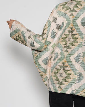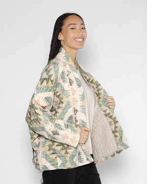 Cette veste pour femme en gaze de coton, aux motifs géométriques kaki, est ultra tendance pour la mi-saison. Son style japonais/kimono rend cette pièce très mode, et sa matière vous gardera bien au chaud ! Le matelassage ajoute du volume et de la texture à vos tenues. On adore !