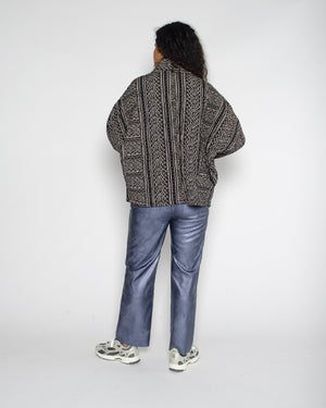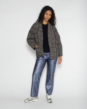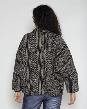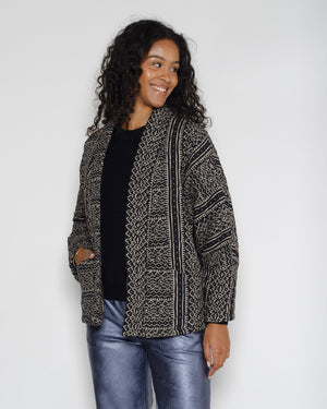 Cette veste pour femme en gaze de coton, aux motifs géométriques noir, est ultra tendance pour la mi-saison. Son style japonais/kimono rend cette pièce très mode, et sa matière vous gardera bien au chaud ! Le matelassage ajoute du volume et de la texture à vos tenues. On adore !