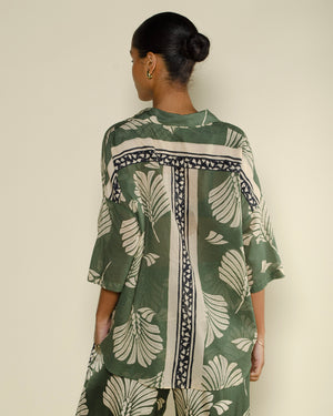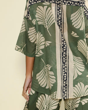 Une chemise Clara de couleur verte à motif palmier et de la marque Diega. Cette chemise Clara imprimée est top tendance pour la saison. La chemise Clara est fluide et légère, parfaite pour l'été.