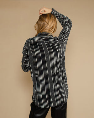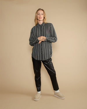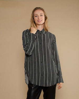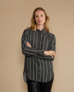 Chemise noire de la marque Laurence Bras, coupe droite et col classique. On adore la porter avec un jean taille haute flare et des mules à talons pour look bossy !
