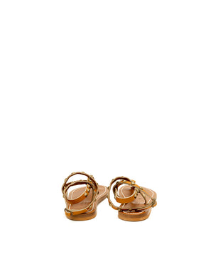 Paire de sandale en cuir camel à fines lanières agrémentées de clous et montantes au niveau de la cheville.